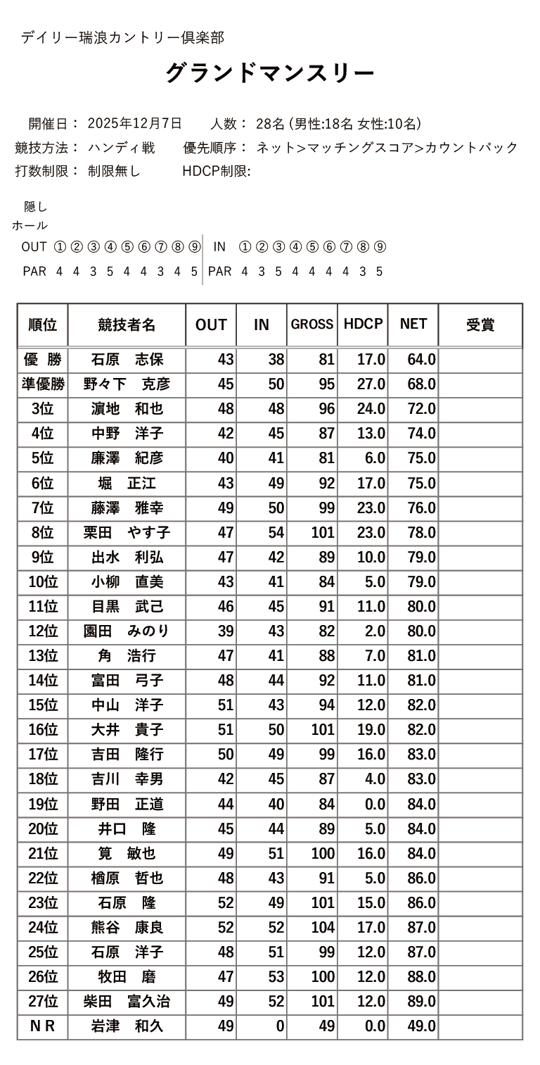 デイリー瑞浪カントリー倶楽部をご利用の皆様、いつもお世話になっております。 下記の様に、2025年度 グランドマンスリーの結果を掲載いたしました。