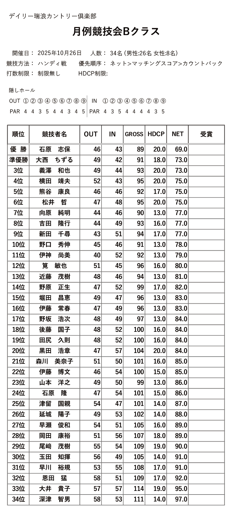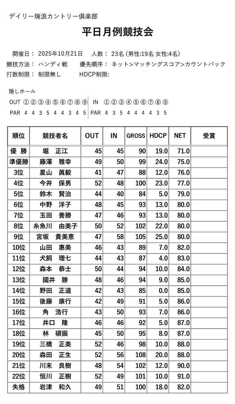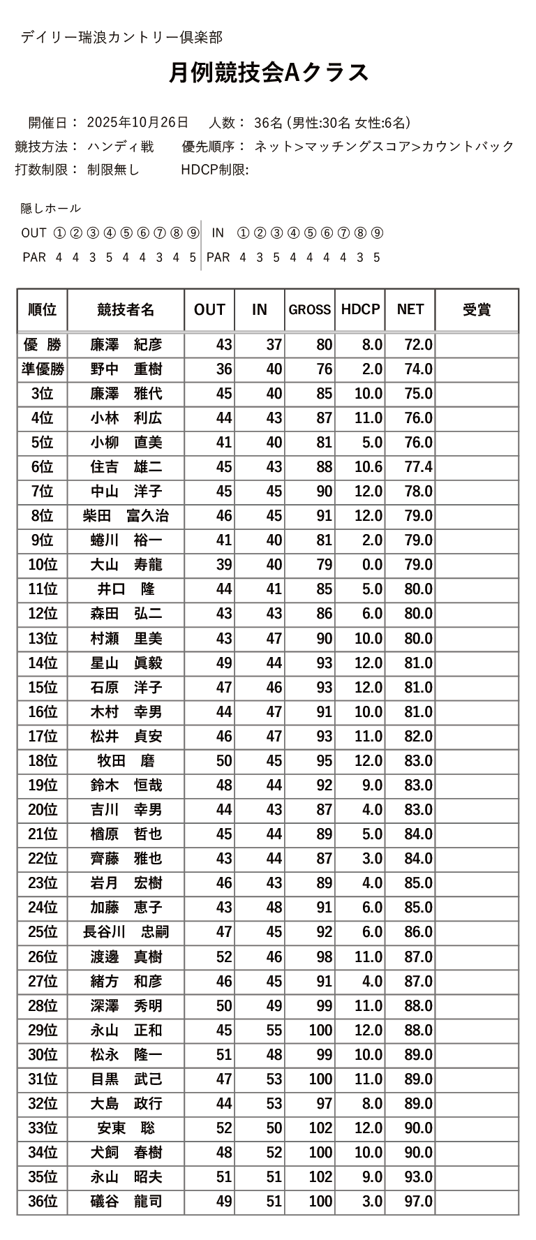 デイリー瑞浪カントリー倶楽部をご利用の皆様、いつもお世話になっております。 下記の様に10月の各競技の結果を掲載いたしました。