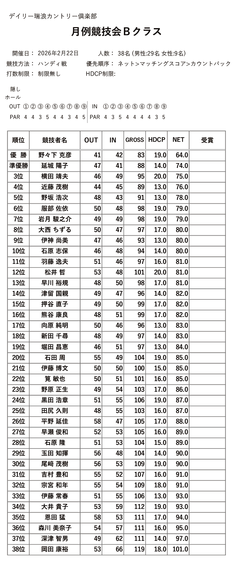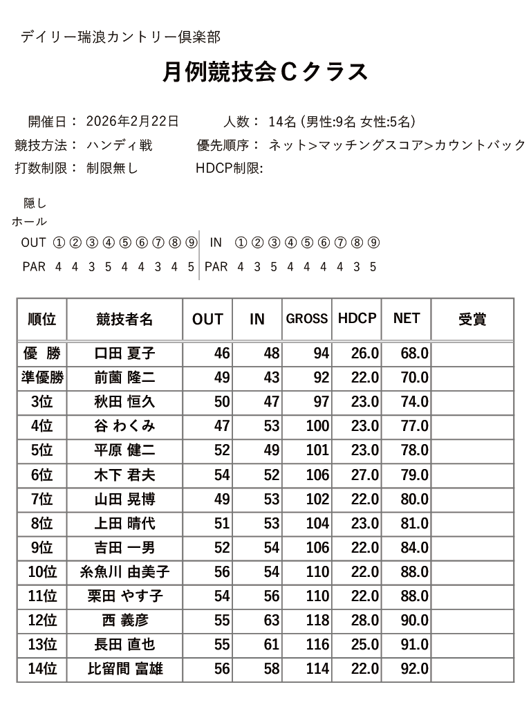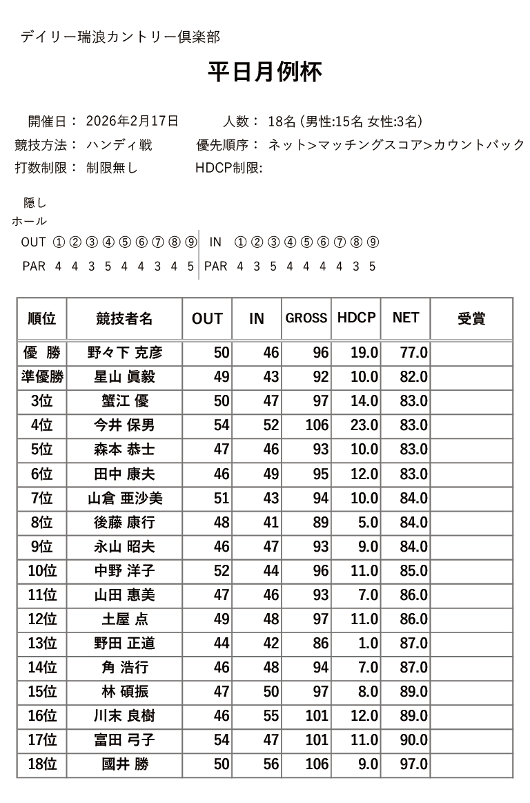 デイリー瑞浪カントリー倶楽部をご利用の皆様、いつもお世話になっております。 下記の様に、2月の各競技の結果を掲載いたしました。